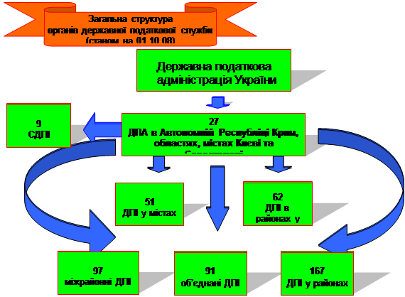 Структура і склад державної податкової служби відповідає адміністративно – територіальному поділу України. Податкова служба будується таким чином, щоб забезпечити єдність цілей, при якій окремі системи одного рівня функціонують по одній схемі, вирішують певний набір задач по заздалегідь розробленій методології і технології обробки даних [4, 48].