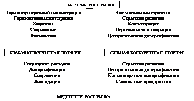 Томпсон и Стрикланд разработали матрицу определения стратегии бизнеса, основанную на 2-х составляющих (скорость развития рынка и уровень развития предприятия, т.е. его конкурентная позиция), характеризующих позицию предприятия на рынке (рис.4).