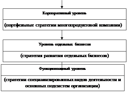 Три уровня стратегий образуют их иерархическую структуру: корпоративная стратегия состоит из ряда стратегий развития отдельных(ого) бизнесов(а) и функциональных стратегий.