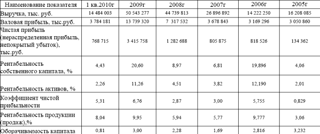 Деятельность компании в 2009 году была относительно успешной – величина чистой прибыли составила 3 415 758 тыс. руб. против 1 282 688 тыс. в 2008 году. Рентабельность собственного капитала увеличилась с 8,97 % до 20,6 % по сравнению с 2008 годом, что является достаточно высоким показателем. Рентабельность активов увеличилась с 4,51 % до 11,26 %, что говорит о более эффективном использовании активов. Рентабельность продукции увеличилась с 5,94 % до 9,95 %. Увеличение оборачиваемости капитала с 2,28 % до 3,0 % свидетельствует о лучшем использовании компанией капитала в 2009 году по сравнению с предыдущим.