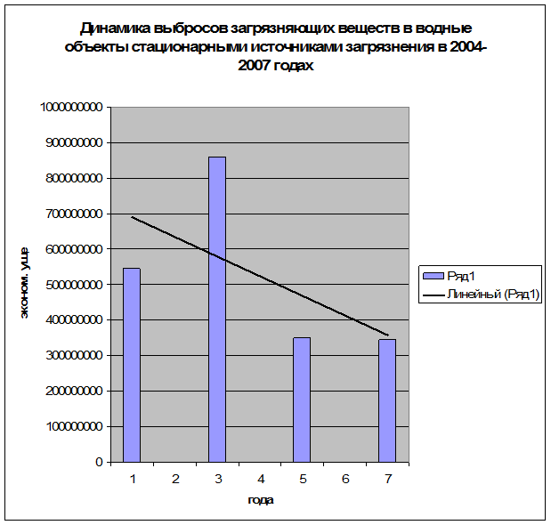 Получив данные экономического ущерба загрязнения водных объектов за четыре года и построив диаграмму можно заметить, что максимальное загрязнение водных объектов стационарными источниками было в 2005 году, а минимальное – в 2007 году.