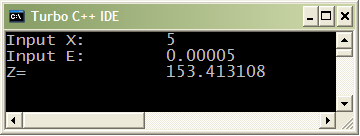 #include<iostream.h> #include<math.h> #include<conio.h> void main() { int n=1; double e,x,r,z; clrscr(); cout<<"Input X:\t"; cin>>x; cout<<"Input E:\t"; cin>>e; z=1+x; if (1>e) { if (fabs(x)>e) { r=x; while (fabs(r)>e) { z+=r; n++; r*=x/n; } cout<<"Z= \t\t"<<z<<endl; } else cout<<"Z=\t\t1"<<endl; } else cout<<"\nОшибка ввода: E>1"<<endl; }