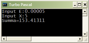Program lab_1; Uses Crt; Var n:integer; e,x,r,z:real; Begin clrscr; n:=1; Write('Input E:');Readln(e); Write('Input X:');Readln(x); z:=1.0+x; if 1.0>e then begin if abs(x)>e then begin r:=x; while abs(r)>e do begin z:=z+r; n:=n+1; r:=r*(x/n); end; writeln('Summa=',z:3:5); end else writeln('Z=1'); end else writeln('Ошибка ввода: E>1 !'); readln; End.