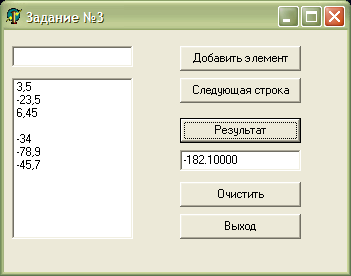 procedure TForm1.Button4Click(Sender: TObject); var l1,l2:integer; sum1,sum2:real; s:string; begin l1:=0;l2:=0;sum1:=0.0;sum2:=0.0; for i:=1 to m do {CALC} for j:=1 to n do begin if g[i,j]>=0.0 then begin sum1:=sum1+g[i,j]; l1:=l1+1; end; if g[i,j]<0.0 then begin sum2:=sum2+g[i,j]; l2:=l2+1; end; end; if l1>l2 then begin str(sum1:3:5,s); Edit2.Text:=s; end; if l1<l2 then begin str(sum2:3:5,s); Edit2.Text:=s; end; if l1=l2 then Edit2.Text:=' "+" = "-" '; end;