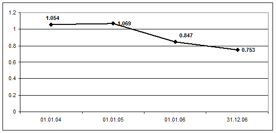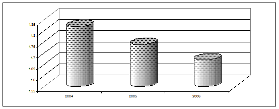 6. Аналіз ліквідності ВАТ „ДніпроАЗОТ” дав змогу визначити, що баланс підприємства протягом звітного періоду не був абсолютно ліквідним. Так, протягом 2004 – 2006 року не виконувався норматив коефіцієнту абсолютної ліквідності. Також узагальнюючий коефіцієнт ліквідності мав тенденцію до зниження і протягом звітного періоду він зменшився на 0,0301%.