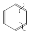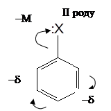 Шість негібридизованих рz-орбіталей, які розміщуються перпендикулярно до s-скелета і паралельно одна до одної, взаємно перекриваються, утворюючи єдину делокалізовану p-електронну хмару, тобто виникає колове спряження (рис.3в). Найбільша електронна густина в цій спряженій системі розміщується над і під площиною s-скелета молекули і охоплює всі шість атомів С у циклі. Завдяки коловому спряженню всі зв¢язки між атомами карбону вирівнюються, вони мають однакову довжину (0,139нм), яка є проміжною між довжиною подвійного зв¢язку в алкенах (0,133нм) і одинарного в алканах (0,154нм). Вирівнювання зв¢язків С–С у бензені графічно зображується правильним колом всередині правильного шестикутника