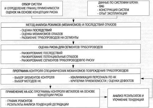 В последнее время для повышения надежности отдельных компонентов и систем, а также безопасности сложных технологических объектов, в целом, был предложен и получил развитие подход, позволяющий применять концепцию риска при построении программ эксплуатационного контроля. Особенно актуальны такие разработки для ядерной отрасли, где часто стоит задача эффективного использования ограниченных материальных и финансовых ресурсов при проведении дистанционного или ручного неразрушающего контроля, продолжительность которого ограничена во времени. Развитие идеологии применения концепции риска для проведения эксплуатационного контроля (Risk Informed In-Service Inspection -RI-ISI) в плане выбора методов НК и разработки процедур самого контроля меняется в сторону интегрирования НК в целостную программу управления сложным объектом, в рамках которой фундаментальным и обязательным является понимание механизмов деградации и повреждений, которые являются характерными для вполне определенного места той или иной системы. При этом, конечно же, процедура НК подразумевает использование конкретных методов, вероятность обнаружения которыми дефектов, обусловленных одним из возможных механизмов деградации, или их совокупностью, максимальна.