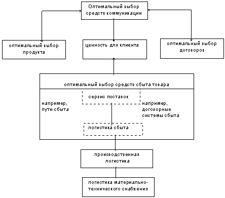 Роли маркетинговой логистики как политике сбыта длительное время не предавалось значение. Преобладало мнение, что производственное распределение товара имеет лишь вспомогательную функцию в связи с обработкой полученных заказов в результате использования других инструментов маркетинга. Оно якобы пассивно служит процессу маркетинга и, тем самым, не представляет собой самостоятельный, активно применяемый инструмент политики сбыта. В частности, на рынках потребительских товаров с весьма однородными по ценам и качеству и, вместе с тем, замещаемыми с точки зрения потребителей продуктами обеспечение пространственной и временной возможности распоряжения продуктами приобретает большое для вербовки клиентов значение. В результате этого физическая услуга предприятия по сбыту товара становится элементом, который может существенно повлиять на решение потенциального клиента произвести покупку. Таким образом, маркетинговая логистика становится самостоятельным, активным инструментом маркетинга предприятия. Основополагающим для концепции логистики является целостное видение, вследствие которого логистика является неотъемлемой концепцией руководства, которая охватывает весь процесс планирования, реализации, управления и контроля всех товарных, грузовых и информационных потоков предприятия от его закупочных рынков, этапов производства до рынков сбыта. Следуя мысли проходимости, нам следует рассматривать оказанные другими предприятиями услуги в сфере логистики (оказание услуг в сфере логистики) как неотъемлемые составные части сквозной системы логистики. В этом проявляется выходящий за рамки предприятия характер концепции логистики. [16]