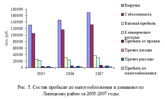 3. Наибольшую долю в бухгалтерской прибыли (до налогообложения) занимает прибыль от продаж, следовательно, ее изменения в большей степени повлияли на общую сумму прибыли. Динамика этой прибыли за 2005 - 2007 гг. положительная. Это обусловлено ростом валовой прибыли в 2006 г. на 16,2% (+4164 тыс. руб) по сравнению с 2005 г. и в 2007 г. на 25,8% по сравнению с 2006 г. (+7719 тыс. руб). Положительным является опережение темпа роста валовой прибыли над коммерческими расходами.