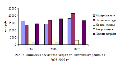 6. Отрицательное влияние на результаты деятельности организации оказывают расходы, не относящиеся на издержки. Это прочие доходы и расходы. Они возмещаются за счет прибыли, и тем самым, ее снижают. В 2007 году прочие расходы, возмещаемые за счет прибыли организации составили 2482 тыс. руб. По сравнению с 2005 г. сумма возросла на 1479 тыс. руб., а по сравнению с 2006 г. - 921 тыс. руб. Рост прочих расходов отрицательно характеризует деятельность райпо. Организация является не совсем надежным партнером в хозяйственных отношениях.