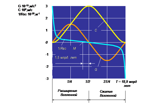 Рис.3 Изменение гравитационной постоянной ( G ), скорости света (С) и кривизны пространства Вселенной (1/RВС
