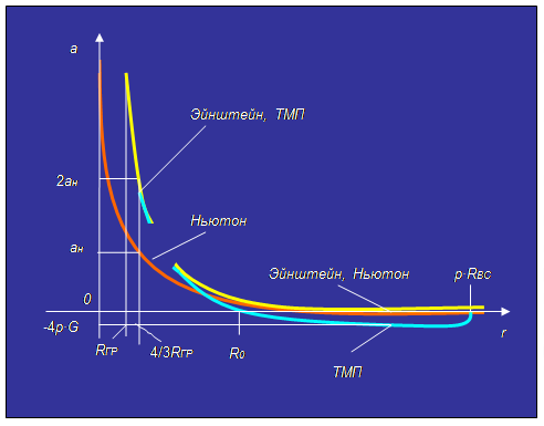 Кривая тяготения Эйнштейна получается из кривой Ньютона параллельным переносом вправо на величину гравитационного радиуса, а кривая тяготения теории многомерных пространств получается из кривой Эйнштейна сдвигом вниз на величину ускорения расширения Вселенной, что приводит к появлению гравитационных сил отталкивания.
