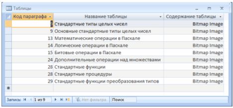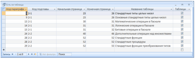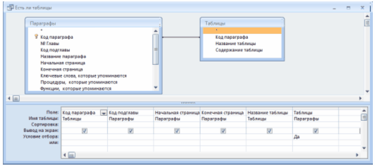 Існує кілька типів запитів: на вибірку, на оновлення, на додавання, на видалення, перехресний запит, створення таблиць. Найбільш поширеним є запит на вибірку. Запити на вибірку використовуються для відбору потрібної користувачу інформації, що міститься в таблицях. Вони створюються тільки для пов'язаних таблиць [9]. Запит «Наличие таблиц» виводить інформацію про параграфи у яких присутні таблиці.