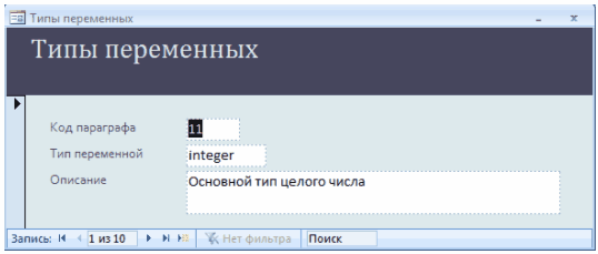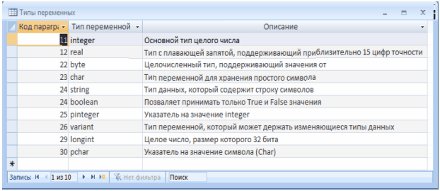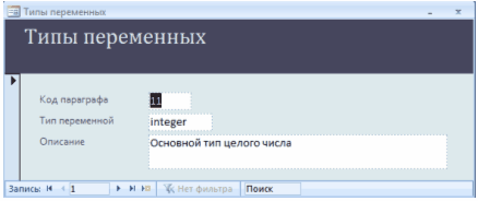 Форма «Типы переменных» (Рисунок 2.3.29) відкривається натисканням кнопки «Типы переменных» у нижній правій частині форми «Параграфы» (Рисунок 2.3.28) і містить інформацію про типи змінних, що розглядаються у параграфах.