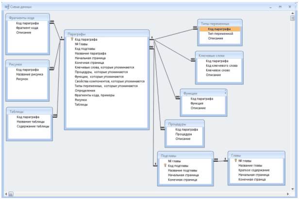Так як дана база є реляційною, то вона містить не окремі таблиці, а групи взаємопов'язаних таблиць. Для створення зв'язків між таблицями використовувалася команда Схема даних меню Сервіс.