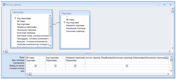 Запит «Кол-во страниц в параграфах» дозволяє отримати інформацію про загальну кількість сторінок у параграфі. Для побудови цього використовувався будівник виразів, за допомогою якого було створено поле, що обчислюється, «Кол-во страниц: [Параграфы]![Конечная страница]-[Параграфы]![Начальная страница]»