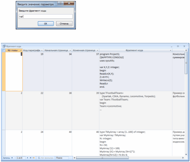 Запит «Поиск по фрагменту кода» є параметричним запитом, що дозволяє відобразити зазначений користувачем фрагменти коду.