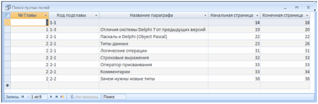 Запит «Поиск пустых полей» виконує пошук параграфів, в яких немає інформації про: определения, ключевые слова, функции, свойства компонентов, типы переменных.