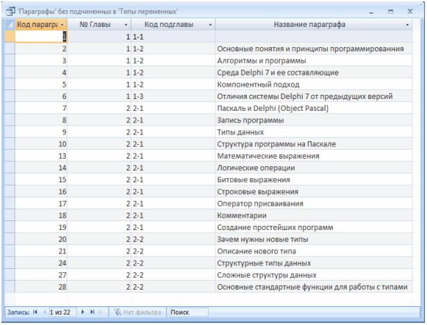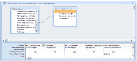 Запит «Без подчиненных» дозволяє побачити параграфи, яким не відповідає ні один запис у підпорядкованої таблиці "Типы переменных".