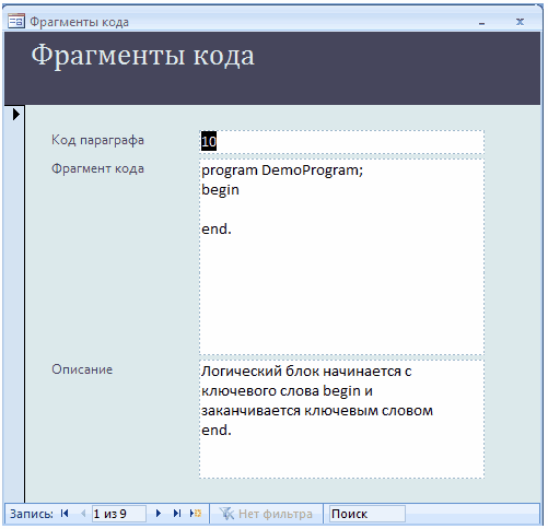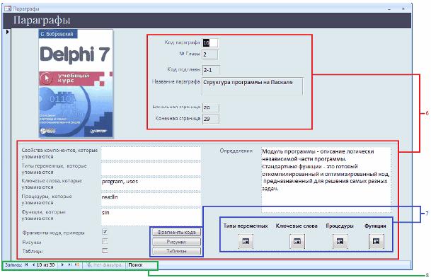 Зміст полів відображається у (6), для відкриття форм «Тип переменных», «Ключевые слова», «Процедуры», «Функции», «Фрагменти кода», «Рисунки», «Таблицы» необхідно скористуватися кнопками (7). Навігация по базі данних відбувається за допомогою навігатора (8).