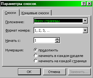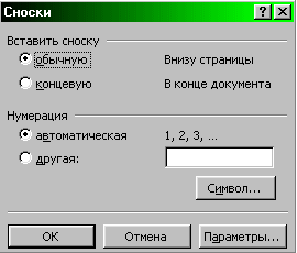 Поле Нумерация предоставляет пользователю возможность установить тип нумерации и формат маркера сносок. Переключатель Авто устанавливает режим автоматической перенумерации сносок. Переключатель Другая позволяет пользователю самостоятельно выбрать формат маркеров сноски. Также можно воспользоваться кнопкой Символ для вставки некоторого символа в качестве маркера сноски. К нопка Параметры диалогового окна Сноски открывает другое окно, в котором можно определить дополнительные параметры для сносок: