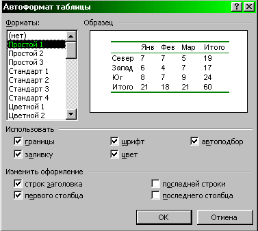 Следует заметить, что пунктирная линия сетки является вспомогательной и на печать не выводится. Перед вводом информации в ячейку следует щелкнуть в ней мышью. Для перемещения между ячейками можно использовать клавишу <Tab>. Содержимое ячеек можно перемещать и копировать, используя буфер обмена или метод drag & drop. Под форматированием таблицы обычно понимается обрамление и заливка целой таблицы или ее отдельных ячеек, изменение ширины столбцов и высоты строк, форматирование текста внутри таблицы. Самый простой способ форматирования выделенной таблицы – использование команды Автоформат из меню Таблица: