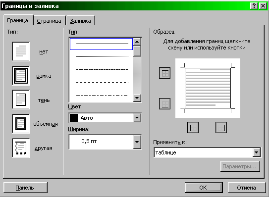В открывшемся окне диалога в списке форматов следует выбрать подходящий и нажать кнопку OK. Таблицу можно отформатировать и вручную. Для этого надо освоить выделение отдельных частей таблицы. Чтобы выделить одну ячейку, щелкните мышью левее маркера конца ячейки; чтобы выделить строку, щелкните левее границы строки (по полосе выделения строки). Для выделения столбца установите указатель мыши выше столбца (он примет форму направленной вниз стрелки) и после этого нажмите левую кнопку. Чтобы выделить несколько строк или столбцов, выполните те же действия, но, не отпуская левую кнопку мыши, переместите ее, “закрашивая” нужную область. Всю таблицу можно выделить, выбрав команду Выделить таблицу из меню Таблица. Символы и абзацы текста таблицы форматируются как обычно. Чтобы добавить элементу таблицы обрамление и заполнение, можно воспользоваться командой Границы и заливка из меню формат. Как видно из рисунка, окно диалога имеет три вкладки: “Граница”, “Страница” и “Заливка”.