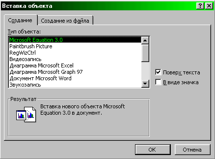 При редактировании таблицы удобно использовать дополнительное меню, которое высвечивается на экране при нажатии провой кнопки мыши (в этот момент таблица должна быть активна или выделен какой-нибудь ее элемент). Как видно из рисунка, многие пункты дополнительного меню дублируют меню Таблица. Кроме того, его содержимое зависит от того, какой элемент таблицы выделен в настоящий момент. Для создания “шапки” таблицы несколько ячеек можно объединить в одну. С этой целью выделите ячейки и используйте команду Объединить ячейки из меню Таблица. Информация становится более наглядной, если ее представить в виде диаграммы. Для быстрого представления содержимого таблицы Word в виде диаграммы можно использовать приложение Graph: Выделите таблицу Word и выберите команду Объект в меню Вставка, а затем - вкладку Создание. Выберите “Диаграмма Microsoft Graph 97” из списка Тип объекта. Далее следуйте указаниям мастера диаграмм. Готовая диаграмма появится в окне Graph. Для модификации диаграммы используйте команды и опции Graph. После выполнения команд Файл Выход и возвращение в… диаграмма будет вставлена в документ сразу после таблицы. Следует заметить, что диаграмма может быть создана и в другом приложении (например, MS Excel, Works или Lotus 1-2-3), после чего ее можно импортировать в документ Word, используя технологию OLE. Иногда в текст документа необходимо ввести формулу. Простые формулы можно создать методами непосредственного форматирования Word. Например: y = ax2 + bx + c. Знак умножения помещен в формулу с помощью команд Вставка Символ. Возведение в степень получено благодаря верхнему индексу «2», который проще всего создать следующим образом: выделить нужный символ, в нашем случае – 2, выполнить команды Формат Шрифт и на вкладке Шрифт установить флажок Верхний индекс. Нижний индекс создается аналогично. Д ля создания сложных формул применяется редактор формул – Equation Editor (дополнительная программа, поставляемая с Word). В качестве примера рассмотрим создание в документе Word следующей формулы: В меню Вставка выберите пункт Объект. В открывшемся окне диалога выберите Microsoft Equation 3.0: На экране появится окно редактора формул, которое отвечает стандартам Windows и содержит строку заголовка, строку меню, строку состояния, а также панель математических символов и панель шаблонов. Последовательность ввода формулы такова: наберите “y=”, выберите шаблон дроби, установите курсор в числителе и выберите шаблон корня квадратного. Каждый шаблон имеет одно или несколько “знакомест” в виде пунктирного прямоугольника. Установите курсор в такой прямоугольник под знаком корня и выберите шаблон модуля. Внутри модуля наберите “a-b”. Установите курсор в знаменателе и выберите шаблон суммы. Аналогичным образам заполните аргументы суммы. После того, как формула введена, щелкните мышью за ее пределами. Формула будет внедрена в документ. Ее можно будет отредактировать позже, дважды щелкнув по ней мышью. Редактор формул располагает шестью основными встроенными стилями (стиль математических символов, текстовый стиль для ввода обычного текста, стиль названий функций, стиль названий переменных и др.). с помощью команды Стиль Определить пользователь может сам задать шрифты и их атрибуты: