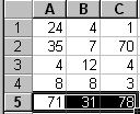 Цифровой шаблон “0” используется для того, чтобы справа и слева от десятичного разделителя вывести не менее определенного количества цифр, добавляя, где необходимо нули. При использовании шаблона “#” незначащие нули справа и слева от десятичной запятой не выводятся. Присвоить формат ячейке или блоку ячеек, предварительно выделив их, можно с помощью команды Ячейкименю Форматили нажав правую кнопку мыши и набрав команду Формат ячеек. В понятие формат ячейки входят также формат используемого шрифта, выравнивание, обрамление и заполнение, защита, которые задаются в диалоговом окне Формат ячеек или с помощью кнопок на панели инструментов (см. прил. 1). Помимо различных типов данных ячейки таблицы EXCEL могут содержать формулы. В формулах допустимо использование следуыщих операторов: сложение (+), вычитание (-), деление (/), умножение (*), возведение в степень (^), =, <, >, <>, <=, >= и так называемых операторов связи диапазона (:), объединение(;) и объединение текстов(&). Для ввода формулы необходимо: 1) выделить яцейку и нажать клавишу = (равно); 2) Набрать формулу и нажать Enter. Например: =2*6-9; =A1*5-B3/2+C4^2 Первая формула содержит только константы и знаки арифметических операций. Вторая формула использует ссылки на ячейки А1, В3 и С4. Содержимое этих ячеек представляется в формулу и после нажатия клавиши Enter вычисляется результат. Таким образом, в ячейке показывается результат вычисления формулы, а саму формулу можно увидить и/или отредактировать только в строке формул, предварительно выделив нужную ячейку. Следует заметить, что ссылки на ячейки во второй формуле можно набрать не только с клавиатуры, а также с помощью мыши. Для этого после нажатия клавиши = (равно) щелкните мышью в ячейке A1 (в строке формул автоматически появится A1), затем наберите *5-, щелкните мышью в ячейке В3 и т.д. Формулы могут содержать ссылки не только на ячейки, но и блоки ячеек, например: =A1:A4+C1:C4, что равносильно формуле =A1+A2+А3+A4+C1+C2+С3+C4 Кроме того, в формулах можно использовать функции. Функция – это заранее определенная формула, которая по одному или нескольким аргументам, заключенным в скобки, вычисляет результат. Рассмотрим наиболее распространенную функцию суммирования, с помощью которой приведенные выше формулы можно записать так: =СУММ(A1:A4;C1:C4); =СУММ(A1; A2;А3;A4;C1;C2;С3;C4); Кнопка Автосуммирование () стандартной панели инструментов облегчает использование функции СУММ(). Пусть, например, требуется вычислить сумму чисел для каждого столбца A, В и C (см. рис. 2а). Выделите ячейку А5, нажмите кнопку Автосуммирование, а затем кнопку Enter. Сумма чисел первого столбца (=СУММ(А1:А4)) появится в ячейке А5. Аналогичную операцию можно повторить для столбцов В и С. Однако удобней применить следующий прием: выделите ячейку А5, установите указатель мыши на маркер в нижнем правом углу ячейки (указатель примет форму жирного плюса) и, удерживая левую кнопку мыши, растяните рамку на соседние ячейки вправо (см. рис. 2б). После того, как левая кнопка мыши будет отпущена, в ячейках В5 и С5 появится результат суммирования.