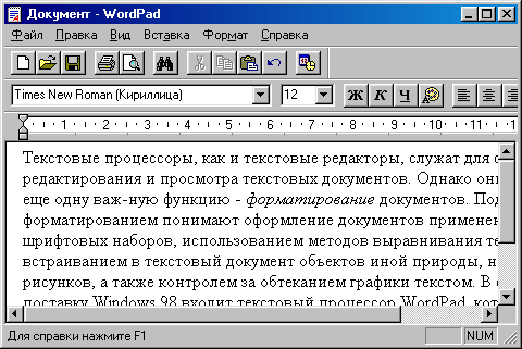 Как видно из этого рисунка, в отличие от текстового редактора Блокнот окно текстового процессора содержит дополнительную панель элементов управления — панель форматирования. Поскольку с приемами создания и редактирования документа мы знакомы по текстовому редактору Блокнот (см. выше), то на примере текстового процессора Word Pad мы ознакомимся с простейшими приемами форматирования документов. Настройка параметров печатной страницы. Форматирование документа предполагает получение полноценного бумажного оттиска на печатающем устройстве. Поэтому работа в текстовых процессорах начинается с задания параметров печатной страницы. Параметры страницы задают в диалоговом окне Макет страницы (Файл | Макет страницы). Настройку параметров печатной страницы следует выполнять в соответствии с тем типом принтера, который предполагается использовать для печати. Для выбора принтера служит кнопка Принтер в диалоговом окне Макет страницы. В раскрывающемся списке Принтер приведены те модели принтеров, на которые настроена конфигурация данного компьютера. После выбора модели принтера выбирают параметры печатной страницы. Размеры листа бумаги выбирают в раскрывающемся списке Размер. В России в качестве стандартного машинописного листа принято использовать лист формата А4, имеющий размер 210х297 мм. Печатное поле документа составляет не весь бумажный лист, поскольку со всех сторон документа должны оставаться белые поля. При выборе размеров полей следует учитывать следующие обстоятельства: если левое поле используют для брошюровки, оно должно иметь увеличенный размер; если при брошюровке предполагается обрезка блока, правое и нижнее поля должны иметь увеличенный размер; если при оформлении документа используются колонтитулы (верхние или нижние), для них следует предусмотреть увеличение размера соответствующих полей. Конкретные значения размеров полей следует выяснить у заказчика документа (работодателя, администрации предприятия). Если никаких рекомендаций нет, можно задать для всех полей, кроме левого, по 15 мм, а для левого поля — 25 мм. Настройка параметров абзаца. Абзац является минимальным элементом форматирования. Настройка параметров абзаца выполняется в диалоговом окне Абзац, открываемом командой Формат | Абзац. Здесь можно задать следующие параметры: величину отступа от левого поля; величину отступа от правого поля; величину специального отступа для первой строки абзаца (используется для создания «красной строки»); метод выравнивания: по левому полю, по центру и по правому полю. К сожалению, текстовый процессор WordPad не имеет средств для выравнивания текста «по формату» — так называется метод выравнивания, при котором текст выравнивается и по левому, и по правому полям одновременно. Для большинства документов, написанных на русском языке, этот метод является стандартным. Настройка параметров шрифтового набора. Тип используемого шрифта, его размер и начертание можно задать как с помощью строки меню (команда Формат), так и с помощью элементов управления, представленных на панели форматирования. В отличие от редактора Блокнот, текстовый процессор WordPad позволяет применять шрифтовое оформление как ко всему документу в целом, так и к отдельным, предварительно выделенным фрагментам. Создание маркированных списков. Создан