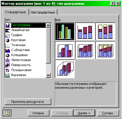 Диаграмма – это графическое представление числовых данных. В Excel используется следующие основные понятия и понятия и определения, которые необходимо знать для правильного и эффективного построения диаграмм. Ряды данных – это наборы значений, которые требуется изобразить на диаграмме. Например, при построении диаграммы дохода компании за последнее десятилетие рядом данных является набор значений дохода за каждый год. Математический аналог рядов данных - это значения функции (Y). Категории служат для упорядочения знаний в рядах данных ( в нашем примере - это годы). Математический аналог категорий - это аргумент функции (X). Легенда - это условные обозначения значений различных рядов данных на диаграмме. В Excel имеется 9 типов двумерных и 6 типов 3-х мерных диаграмм, каждая из которых имеет несколько разновидностей. Рассмотрим некоторые из них. В диаграмме с областями отдельные ряды данных представлены в виде закрашенных разными цветами областей. При использовании линейчатой диаграммы отдельные значения будут представлены полосами различной длинны, расположенными горизонтально вдоль оси X. Длина полосы соответствует величине числового значения. Линейчатая диаграмма, в которой отдельные значения представлены вертикальными столбиками различной длинны, называется гистограммой. Для всех трех указанных выше типов диаграмм при выборе соответствующего формата каждый ряд значений можно представить как долю от общей суммы. На графике все отдельные значения будут соединены между собой линиями, полученными путем интерполяции. График не стоит использовать, если отдельные абсолютные значения не взаимосвязаны. При использовании круговой диаграммы сумма всех значений принимается за 100%, а процентное соотношение величин изображается в виде круга, разбитого на несколько секторов разного цвета. В круговой диаграмме допускается только один ряд данных. Кольцевая диаграмма – это особый вид круговой диаграммы. В этом случае сумма всех значений также принимается за 100%, а ряды данных представляют собой вложенные кольца, разделенные на сегменты в процентном отношении. Преимущество кольцевой диаграммы перед круговой состоит в возможности одновременного изображения нескольких рядов данных. Радар – это диаграмма, в которой категории представляются лучами, расходящимися из одной точки. Каждое значение ряда данных будет выделено на оси и соединено с другими замкнутой линией. На XY (точечной) диаграмме отдельные значения таблицы представляются точками в декартовой системе координат, которые не соединены линиями. Этот вид диаграммы больше всего подходит для представления независимых отдельных значений. При создании объемных диаграмм с областями используется система координат с тремя осями. Объемная гистограмма, объемная линейчатая и объемная круговая диаграммы позволяют достичь эффекта пространственного представления данных. Объемный (трехмерный) график приобретает форму лент. Принцип построения объемных поверхностей диаграмм напоминает применяемый в картографии способ представления на физических картах высоты участка местности над уровнем моря. Для создания диаграммы необходимо выделить блок ячеек с данными, а также названиями рядов и категорий. После этого можно воспользоваться командой Диаграмма из меню Вставка или кноп