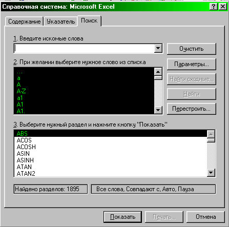 M S EXCEL содержит 320 встроенных функций. Простейший способ получения полной информации о любой из них заключается в переходе на вкладку Поискиз меню ?, после чего необходимо напечатать имя нужной функции и нажать кнопку Показать.