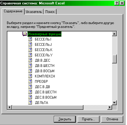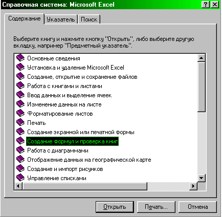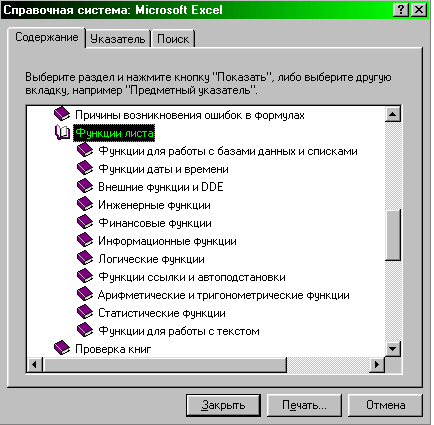 Для удобства функции в EXCEL разбиты по категориям (матаматические, финансовые, статистические и т. д.) . Зная, к какой категории относится функция, справку о ней можно получить следующим образом: Щелкните на закладке Содержание в верхней части окна, а затем последовательно пункты Создание формул и проверка книг, Функции листа. Щ