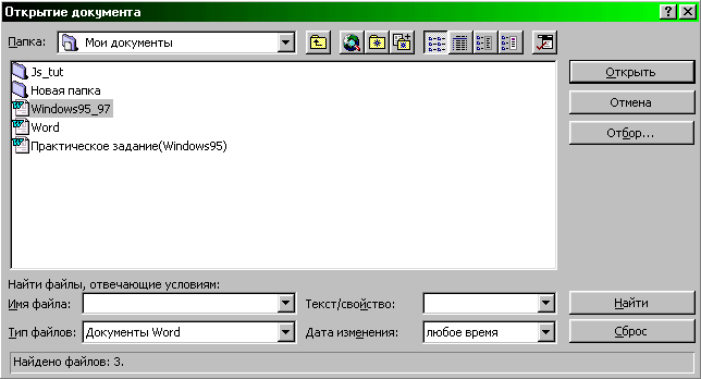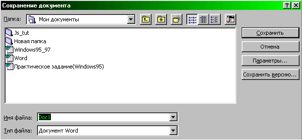 После выбора папки (каталога), типа документа и имени файла из соответствующих списков диалогового окна будет открыто новое окно, содержащее нужный документ. Для сохранения документа на диске используется кнопка Сохранить или команда Сохранить (Сохранить как) из меню Файл. В поле Папка следует указать нужный каталог, в поле Имя файла – имя сохраняемого документа, а в поле Тип файла – “документ Word”, затем нажать кнопку OK.