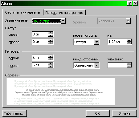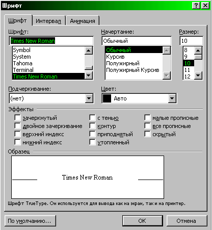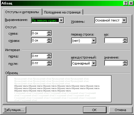 Под форматом символа в Word понимается: шрифт (например, Arial Cyr, Times New Roman Cyr, Baltica и др.); начертание (обычный, курсив, полужирный и др.); размер (кегль); подчеркивание (одиночное, двойное, штриховое); эффекты (верхний индекс, нижний индекс, зачеркнутый, малые прописные и др.); цвет; межбуквенный интервал (нормальный, уплотненный, разреженный). В се перечисленные выше параметры символов можно задать, выбрав команду Шрифт из меню Формат в окне диалога “Шрифт”. Под форматом абзаца в Word понимается: отступ (слева, справа, красная строка); интервалы (межстрочный, перед, после); выравнивание (влево, вправо, по центру, по ширине); обрамление и заливка; положение на странице: