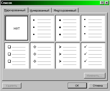 Word позволяет автоматически оформлять абзацы документа в виде списков. Для этого необходимо выделить нужные абзацы и выполнить команды Формат Список или нажать соответствующую кнопку: