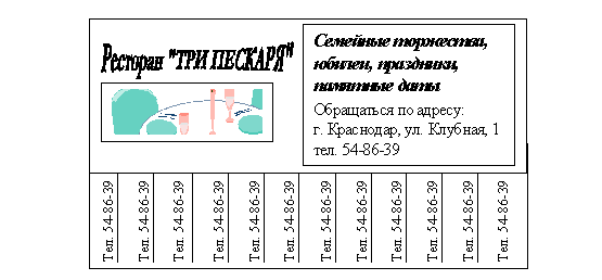 Такое объявление состоит из: рисунка, текста, выгнутого с помощью WordArt, обычного текста и “отрывных телефонов”. Приведем последовательность действий при создании настенного объявления с использованием текстовых полей. С помощью кнопки Надпись панели инструментов “Рисование” создайте текстовое поле №1, совпадающее по размерам с объявлением. В меню Формат выберите пункт Границы и заливка и создайте рамку вокруг текстового поля №1. В левом верхнем углу поля №1 создайте поле №2 (без обрамления), в котором будет размещаться название ресторана. В меню Вставка выберите Объект WordArt пункта Рисунок. На экране появится окно WordArt. Выберите любой из предлагаемых эффектов. В следующем диалоговом окне в поле Ввод текста наберите название ресторана. Задайте размер шрифта (12), начертание (полужирный курсив). Закончив создание текстовых эффектов, нажмите OK. В текстовом поле №2 появится название ресторана. Создайте текстовое поле №3 и наберите в нем текст объявления. Отформатируйте его. Установите курсор в ту строку, где будет располагаться первый слева отрывной телефон. Далее, воспользовавшись командой Направление текста меню Формат, сделайте его вертикальным и наберите номер телефона. С помощью пункта Границы и заливка меню Формат добавьте к номеру телефона обрамление слева, снизу и справа. Скопируйте телефон в буфер и размножьте его столько раз, сколько он поместится по ширине в текстовом поле №1. Последней задачей является размещение рисунка под названием ресторана. Для этого создайте текстовое поле №4. В меню Вставка выберите пункт Рисунок и в открывшемся диалоговом окне в списке файлов укажите подходящий, нажми кнопку OK. При необходимости текстовые поля можно отцентрировать относительно друг друга с помощью мыши. Сохраните полученное настенное объявление.