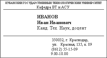 Объекты, созданные в WordArt, можно в дальнейшем редактировать. Для этого достаточно дважды щелкнуть мышью по объекту и на экране автоматически раскроется окно WordArt, в котором можно будет изменить текстовый эффект, шрифт и т.д. Рассмотренная последовательность действий при создании настенного объявления не является единственной и, возможно, самой оптимальной. Однако она позволяет получить опыт использования текстовых полей. Контрольные вопросы и задания Охарактеризуйте назначение каждой кнопки панели инструментов “Рисование”. Что такое текстовое поле и как его создать? Как с помощью текстового поля разместить текст поверх рисунка? Как создать обрамление вокруг текстового поля и заполнить его цветом? Как закруглить углы у рамки текста и добавить тень? Как разместить в текстовом поле рисунок? Что делать, если текст не помещается в созданное текстовое поле? Для чего предназначена программа WordArt и как ею пользоваться? Как отредактировать объекты WordArt? Какие способы можно использовать для копирования отрывных телефонов в настенном объявлении? Тема 4. РАЗРАБОТКА ВИЗИТНЫХ КАРТОЧЕК Цель: изучение параметров страницы, обрамления и заполнения абзацев, размещение рисунков, способов использования специальных символов и размещения нескольких объектов на странице. Порядок выполнения работы: Изучите методические рекомендации. Разработайте свою служебную визитную карточку и размножьте ее на странице, используя буфер обмена или метод drag & drop. Разработайте свою личную визитную карточку и размножьте ее на странице с помощью таблицы. Ответьте на контрольные вопросы. Методические рекомендации Различают два основных вида визитных карточек: личные и служебные, которые имеют различия как в оформлении, так и в содержании размещенной информации. Личная визитная карточка может содержать телефон и имя владельца, информацию о его частных увлечениях и интересах, специальные символы (например, астрологические знаки), а также рисунки и иллюстрации. Служебная визитная карточка, в отличии от личной оформляется более строго. Задача такой карточки – представить владельца с деловой точки зрения, указав его должность, официальные степени и звания, название предприятия рабочий телефон. Правила разработки визитной карточки, в основном, повторяют общие издательские правила оформления документа и подразумевают: выбор формата документа, гарнитуры (вида), кегля (размера) и стиля начертания шрифта, выравнивание абзацев, отступов и межстрочного интервала, а также при необходимости размещение графических объектов. Создание нового документа Данный этап является начальным практически для любого нового документа, основанного на шаблоне Обычный, и подразумевает нажатие кнопки Создать или использование меню Файл Создать OK. Установка формата визитной карточки В настоящее время широко распространены следующие форматы визитных карточек: 9,0х5,0 см; 9,0х5,5 см; 9,5х5,0 см; 10,0х5,0 см; 10,4х5,3 см. Для установки формата можно использовать, по крайней мере, два подхода: установить параметры страницы, соответствующие формату визитной карточки; создать текстовое поле, совпадающее по размерам с визитной карточкой. В первом случае в меню Файл необходимо выбрать пункт Параметры страницы и в открывшемся окне диалога сначала выбрать вкладку Размер бумаги, а затем задать высоту, 
