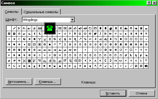 В изитная карточка, полученная в результате форматирования символов и абзацев в нашем примере, может выглядеть так: Использование специальных знаков и символов Интересные возможности при оформлении визитных карточек предоставляет использование специальных символов и знаков (например, изображение телефонного аппарата вместо слова “телефон”). В состав оболочки Windows входит шрифт Wingdings, содержащий ряд специальных символов. Чтобы воспользоваться им, в списке шрифтов на панели инструментов необходимо выбрать Wingdings, а затем, зная раскладку клавиатуры для этого шрифта, нажать нужную клавишу. Если раскладка клавиатуры не известна, то можно: последовательно нажимая клавиши, найти нужный символ (так, для ввода символа следует одновременно нажать клавиши <Shift> и <(>); воспользоваться меню Вставка Символ. Выберите в списке шрифтов Wingdings и щелкните мышью по ножному символу. Затем нажмите кнопки Вставить и Закрыть. Следует заметить, что размер полученного таким образом символа можно изменять также, как любого другого символа.