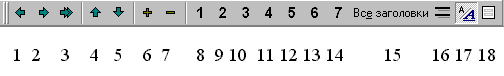 Назначение кнопок: 1 – повышает уровень выделенного абзаца на единицу; 2 – понижает уровень выделенного абзаца на единицу; 3 – преобразует выделенный заголовок в обычный текст; 4,5 – перемещают выделенные абзацы выше предыдущего (ниже следующего) элемента в структуре документа; 6 – кнопка Развернуть отображает следующий, более низкий по отношению к выделенному фрагменту, уровень структуры; 7 – кнопка Свернуть прячет самый низкий уровень в выделенном фрагменте; 8-14 – отображают заголовки соответствующего уровня; 15 – отображает заголовки всех уровней и текст; 16 – кнопка Показать первую строку включает и выключает режим отображения только первой строки текста; 17 – кнопка Показать формат включает отображение символов оформления документа; 18 – кнопка Главный документ. Пример. Необходимо разработать структуру реферата “на тему Планирование рекламной компании”. Перейдите в режим просмотра структуры документа, нажав соответствующую кнопку. Наберите названия будущих глав, разделов и подразделов. Первоначально они будут иметь стиль Заголовок 1. Используя описанные выше кнопки панели инструментов “Структурирование”, повысьте (понизьте) каждый абзац до нужного уровня: На данном этапе реферат состоит только из заголовков различного уровня. Чтобы разместить в нем текст, удобно сначала в режиме просмотра структуры документа добавить в каждый раздел одну простую текстовую строку, а затем перейти в привычный режим разметки страницы. С этой целью в меню Вид необходимо выбрать пункт Разметка страницы или нажать соответствующую кнопку. Далее следует набрать текст. В Word имеются средства для автоматической нумерации заголовков. В меню Формат выберите пункт Нумерация заголовков и в открывшемся окне диалога выберите нужный стиль нумерации и нажмите кнопку OK. В результате этих действий к каждому абзацу, отформатированному ранее как заголовок, будет добавлен соответствующий номер. При добавлении или удалении элементов структуры документа заголовки будут автоматически перенумеровываться. Стиль нумерации заголовков можно изменить, повторно выбрав команду Формат Нумерация заголовков и выбрав новый стиль нумерации. Чтобы удалить нумерацию заголовков, необходимо в диалоговом окне “Нумерация заголовков” нажать кнопку Удалить. Пользователь может самостоятельно изменить стиль нумерации заголовков, для этого используется кнопка Изменить. Ниже показан один из способов нумерации заголовков для нашего примера: Непременные атрибуты большого документа – сноски. В общем случае под сноской понимают дополнительный текст, помещенный внизу страницы под основным текстом и отделенный от него прямой чертой. Сноски могут содержать комментарии, пояснения, переводы, ссылки на первоисточники и т.д. Сноска состоит из двух неразрывно связанных между собой частей: надстрочного указателя сноски в тексте и собственного текста сноски, соответствующего этому указателю. Указатель (или маркер) сноски может быть порядковым номером сноски на странице, символом или значком. При использовании автоматической нумерации маркеры сносок изменяются всякий раз, когда пользователь вставляет, удаляет или перемещает текст сноски. Чтобы поместить на странице сноску, в меню Вставка выберите пункт Сноска. На экране появится окно диалога: