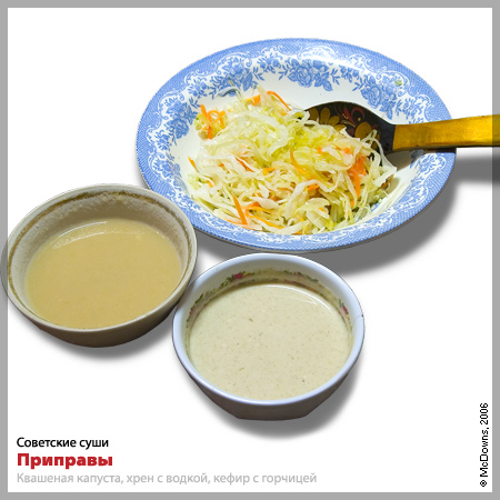 Второй соус, менее острый, для язвенников и трезвенников, приготовлен из кефира с добавлением русской столовой горчицы (примерно столовая ложка на 200 мл). Соль также предлагаем добавлять по вкусу, еще можно прибавить мелко нарубленной зелени. Вместо маринованного имбиря, конечно же, мы использовали квашеную капусту, сдобренную растительным маслом.