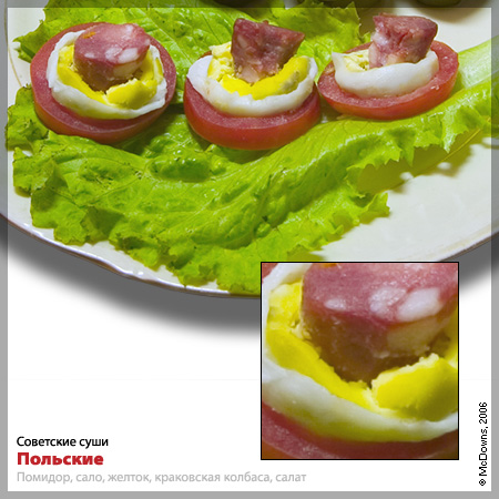 Согласитесь, в советское время Польша (да и большинство стран соцлагеря) воспринимались нами почти как родные. В память этого — суши польские: на листе свежего салата, в помидорном кольце кусочек соленого сала, желток и вставленный в него кусочек краковской колбасы. И не нужно вспоминать про «гнилую конину»: краковская колбаса — отличный вкусный продукт.