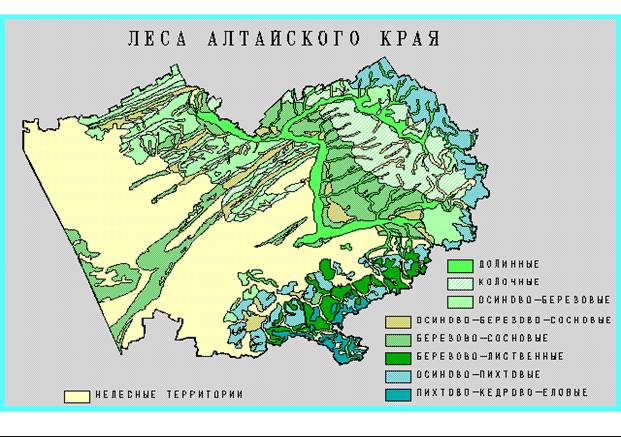 Леса края. Общая площадь лесного фонда в крае составляет 4375,1 тыс. га (26% от всей территории региона), в том числе покрытая лесом 3635,6 тыс.га. Лесистость Алтайского края – 21%. Распределены леса на территории края неравномерно. В Кулундинской степи и лесостепной зоне левобережья Оби лесистость составляет 12%, в правобережье Оби 24%, повышаясь в горной части до 34%. Запас древесины составляет – 523,5 млн. куб. м. Преобладающими породами в лесах края являются хвойные – 43,2% (в т.ч. кедр 1,1%), мегколиственные – 56,8 %. Средний возраст насаждений – 62,8 лет, в том числе хвойных – 84,6 лет и лиственных – 47 лет. По лесохозяйственным и лесоэкономическим условиям, роли и значению лесов в крае выделено 4 лесохозяйственных района: Ленточно-боровой, Приобский, Салаирский и Предгорный. На территории Алтайского края условия для лесных пожаров возникают с апреля по октябрь включительно. Для ликвидации последствий лесных пожаров, гибели насаждений от вредителей и болезней леса, увеличения лесопокрытой площади проводятся лесовосстановительные мероприятия. Ежегодный объем проведения лесовосстановительных работ в крае составляет свыше 10 тыс.га.