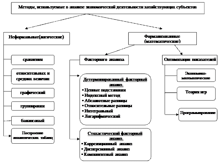 А к формализованным – методы оптимизационного решения задач (теория игр, программирование и экономико-математические), а так же методы факторного анализа, который в свою очередь бывает детерминированным (метод цепных подстановок, абсолютных и относительных разниц, индексный, интегральный) и стохастическим (корреляционный, дисперсионный, компонентный).