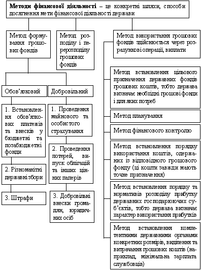 — самостійності в установлених законодавством межах. Методи, тобто способи здійснення, фінансової діяльності -це сукупність прийомів і засобів, з допомогою яких уповноважені державою органи від її імені формують, розпоряджаються і використовують фонди грошових ресурсів.