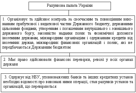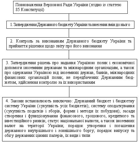 Так, відповідно до Конституції України Верховна Рада України затверджує Державний бюджет, здійснює контроль за його виконанням, приймає рішення по звіту про виконання Державного бюджету, а також затверджує рішення про наданні Україною позик і економічної допомоги іноземним державам і міжнародним організаціям, а також про отримання Україною від іноземних держав, банків і міжнародних фінансових організацій позик, здійснює контроль за їх використанням.