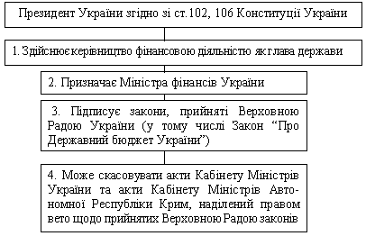 Президент України як глава держави забезпечує в області фінансів погоджене функціонування і взаємодію органів державної влади, визначає основні напрямки фінансової політики держави, здійснює керівництво фінансовою діяльністю. Президент призначає Міністра фінансів, подає на затвердження Верховної Ради України кандидатуру голови Національного банку України і призначає половину складу Ради Національного банку України. Глава держави наділений повноваженнями по створенню в межах коштів, передбачених в Державному бюджеті України, консультаційних, дорадчих і інших допоміжних органів і служб.