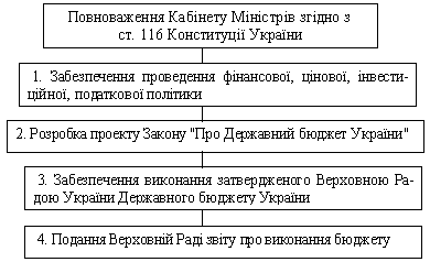 Кабінет Міністрів України є вищим органом в системі органів виконавчої влади. Він відповідає перед Президентом України, підзвітний і підконтрольний Верховній Раді України. В області здійснення фінансової діяльності функції уряду - це забезпечення фінансової політики, розробка законів про Державний бюджет України, надання Верховній Раді звітів про його виконання.