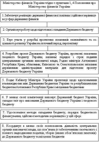 — розробка проекту Державного бюджету України та прогнозних показників зведеного бюджету України, забезпечення у встановленому порядку виконання Державного бюджету України, контроль за додержанням правил складання звіту про виконання Державного бюджету України та зведеного бюджету України;