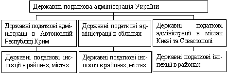 Державна податкова адміністрація України, як центральний орган виконавчої влади, підпорядковується Кабінету Міністрів України, який затверджує її структуру, спрямовує і координує роботу. Голова ДПА України, якого призначає на посаду та звільняє з посади Президент України за поданням Прем’єр-міністра України, очолює Державну податкову службу України. Залежно від кількості платників податків та інших місцевих умов, ДПА України може утворювати міжрайонні (на два і більше районів), об’єднані (на місто і район) державні податкові інспекції. У складі органів державної податкової служби знаходяться відповідні спеціальні підрозділи з боротьби з податковими правопорушеннями (податкова міліція). У ДПА України та ДПА в Автономній Республіці Крим, областях, містах Києві та Севастополі утворюються колегії. Чисельність і склад колегії ДПА України затверджується Кабінетом Міністрів України, а колегій ДПА в Автономній Республіці Крим, областях, містах Києві та Севастополі – ДПА України. Колегії є дорадчими органами і розглядають найважливіші напрями діяльності відповідних державних податкових адміністрацій.